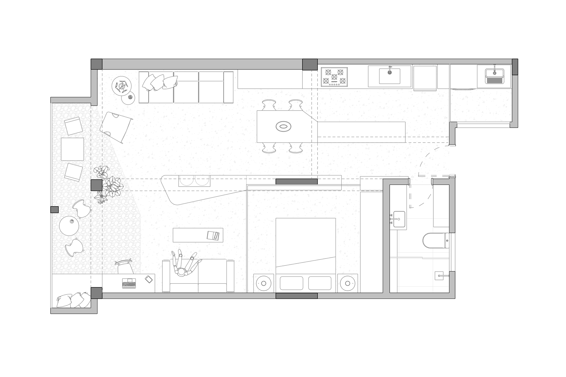 Localizado em um edifício projetado por Artacho Jurado, no bairro da Vila Buarque, o Apartamento Praça foi projetado para um jovem arquiteto, que optou por se mudar para o centro da cidade de São Paulo. O projeto buscou potencializar ao máximo a integração entre os ambientes, conforme desejado pelo morador e também coautor do projeto. Salvo as paredes que delimitam o banheiro, todas as demais foram demolidas, configurando assim, um grande ambiente aberto e multifuncional.